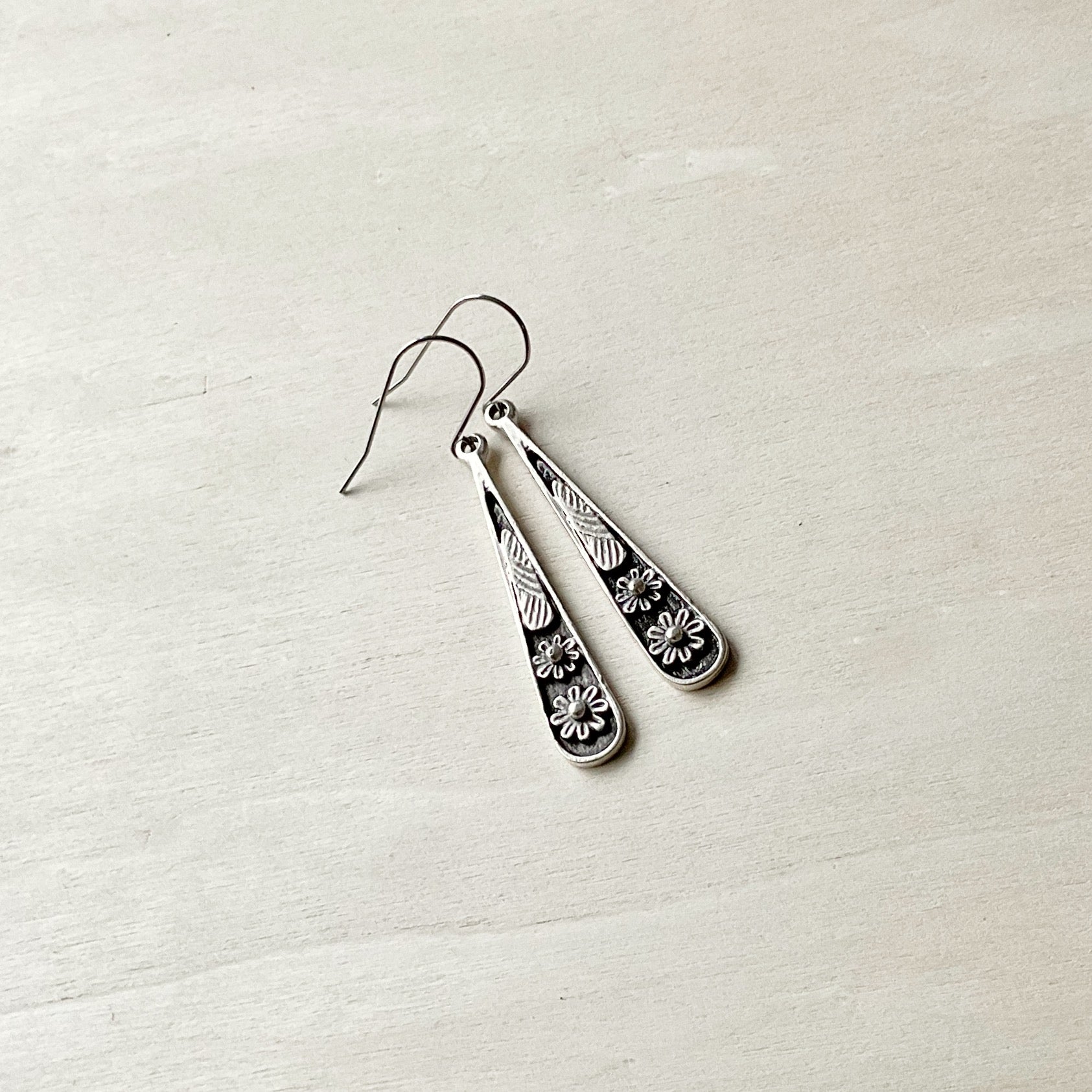 These organic drops are plated in antique silver and then oxidised to bring out the details. They are on hypoallergenic stainless Steel ear wires suitable for even the most sensitive ears - these are the perfect statement earring for anyone who loves nature and artisan jewellery.