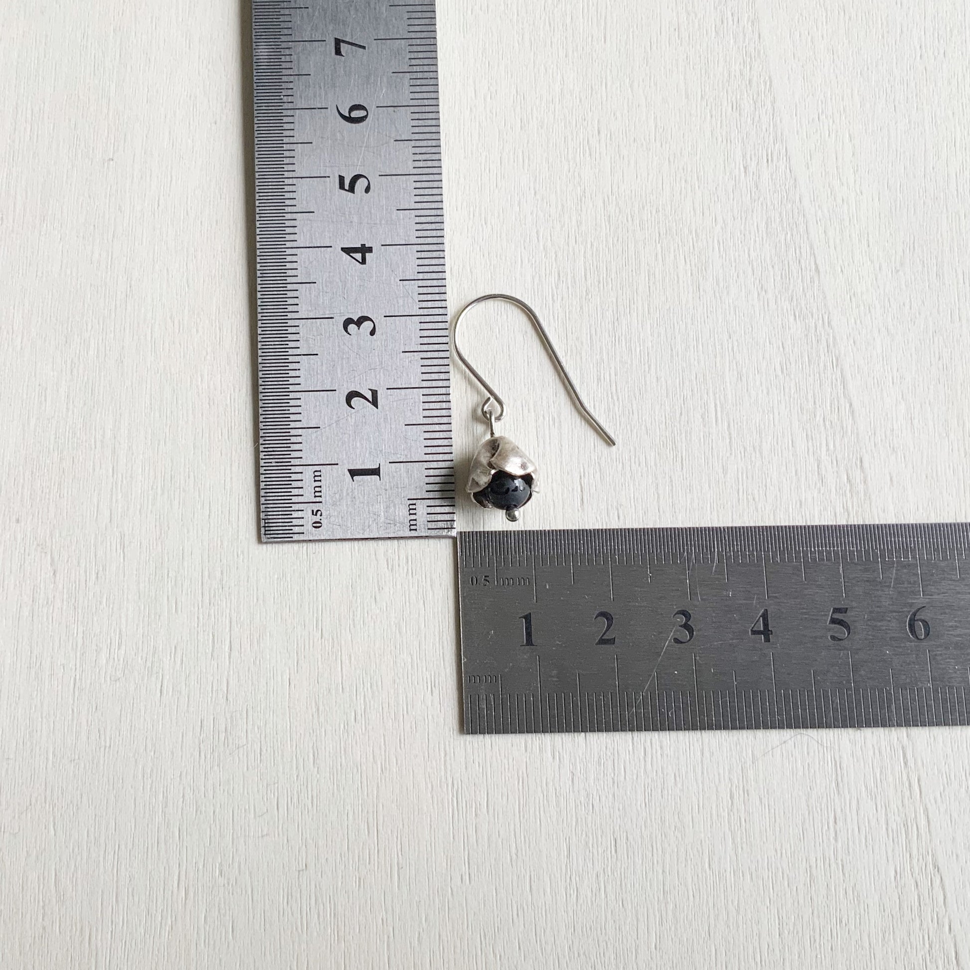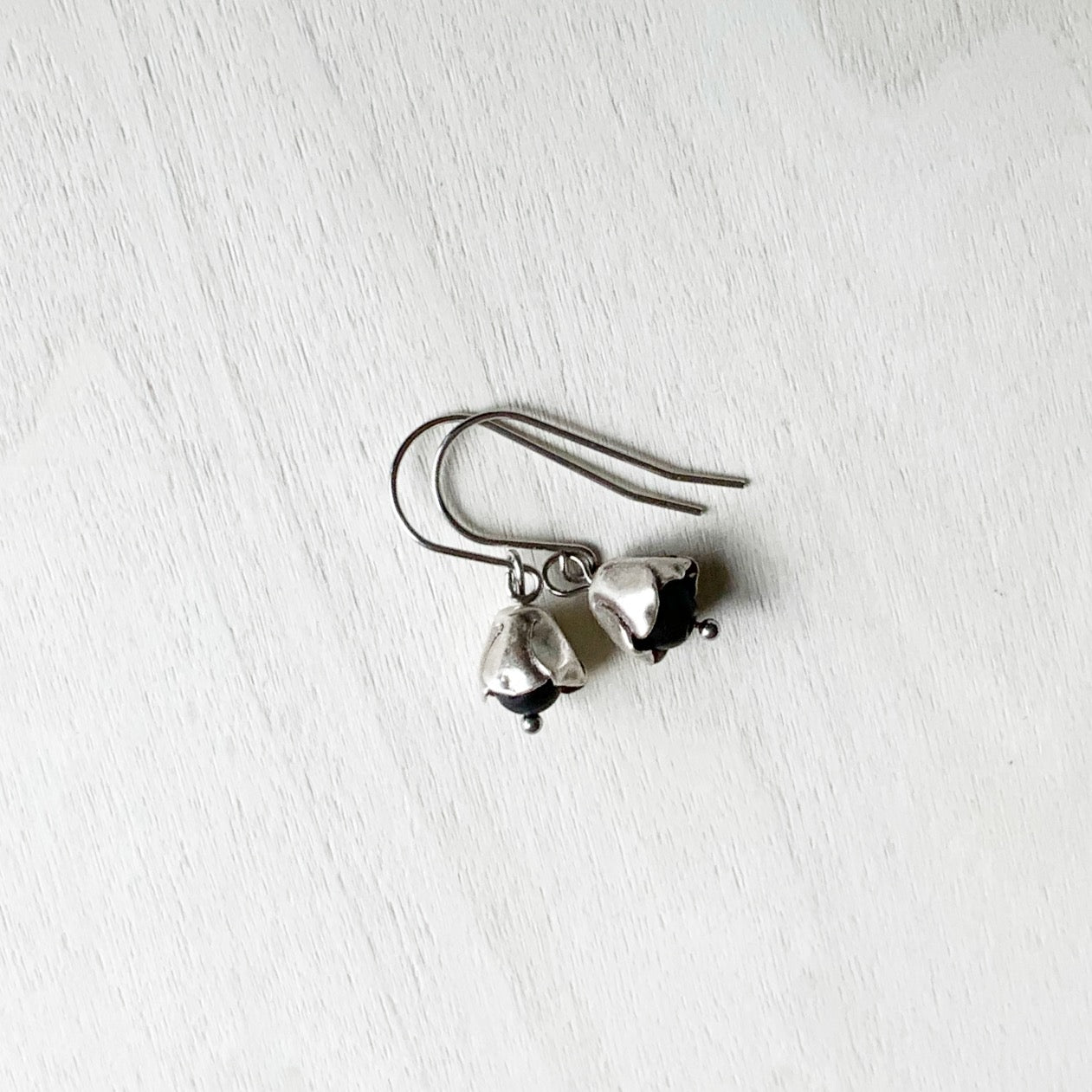 These fold form tulips have been crafted from brass and plated in fine silver (999) then oxidised and sealed to bring out the detail and give that beautiful antique finish. They are completed with hand selected black glass beads and stainless steel findings.