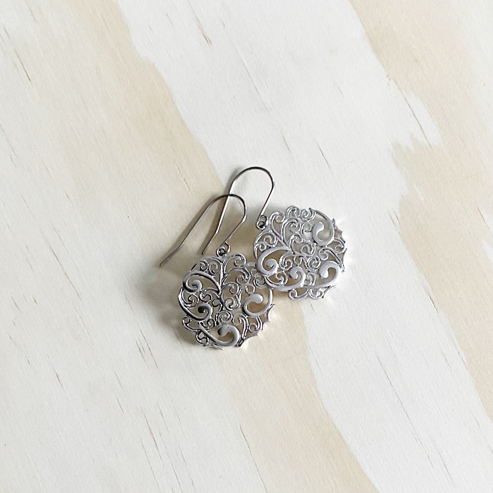 These made to order earrings have been crafted from delicate and ornate brass findings and carefully plated in the finest platinum to give an incredibly beautiful matte finish that highlights every detail.