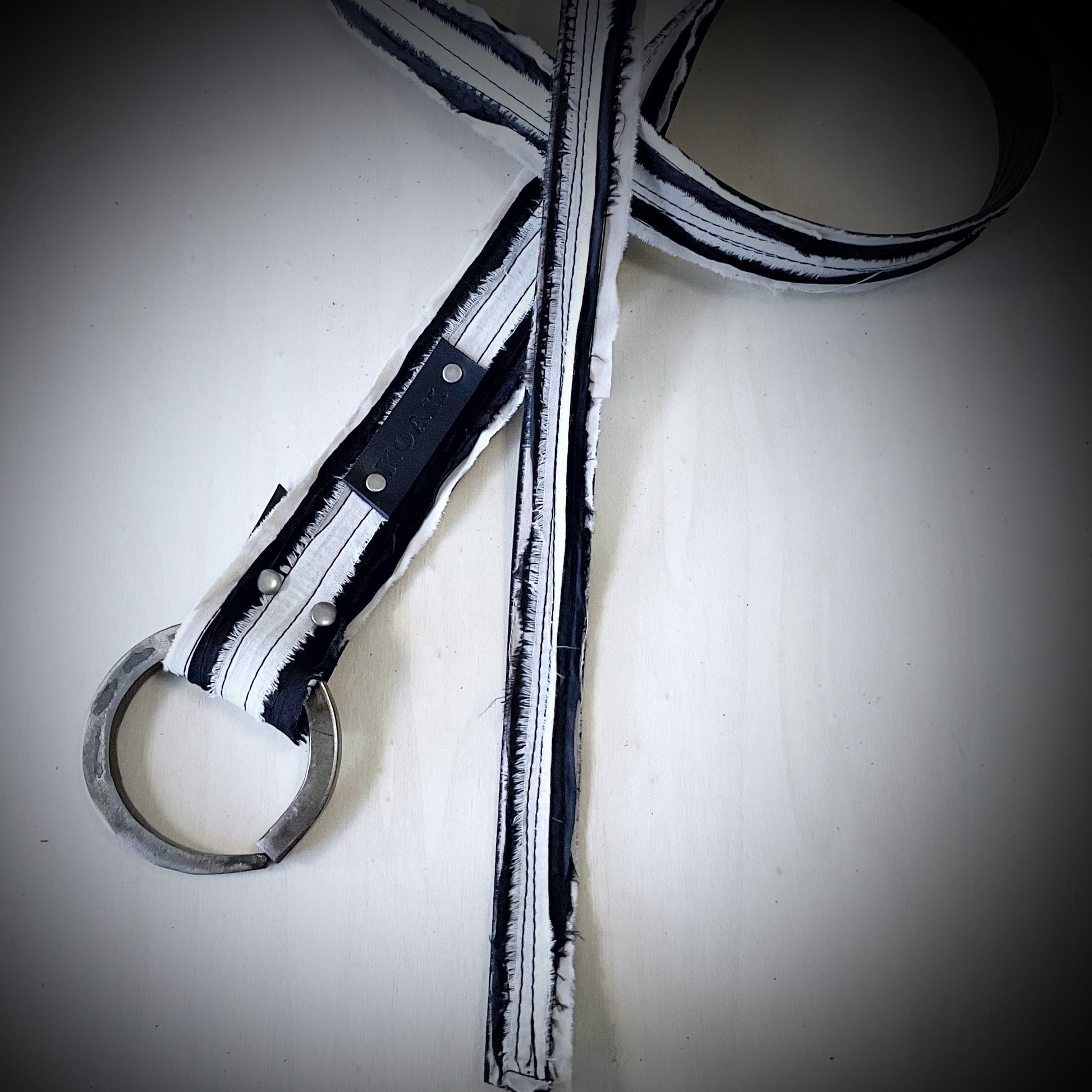A tapered chunky steel elongated square ring forms the basis for this belt that can be fashioned in a knot of your liking.