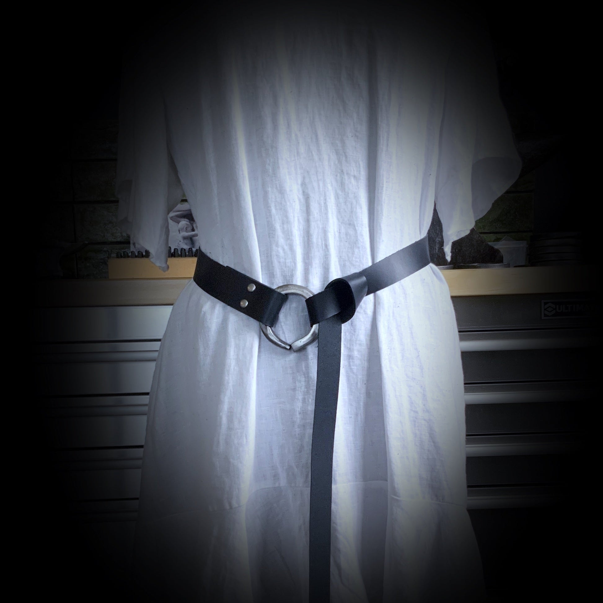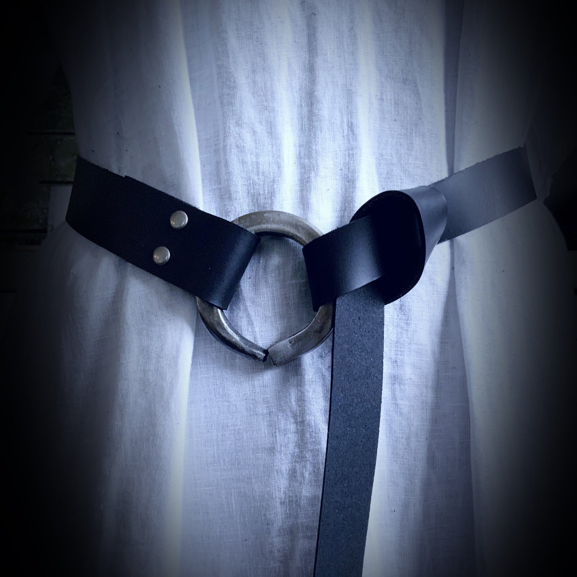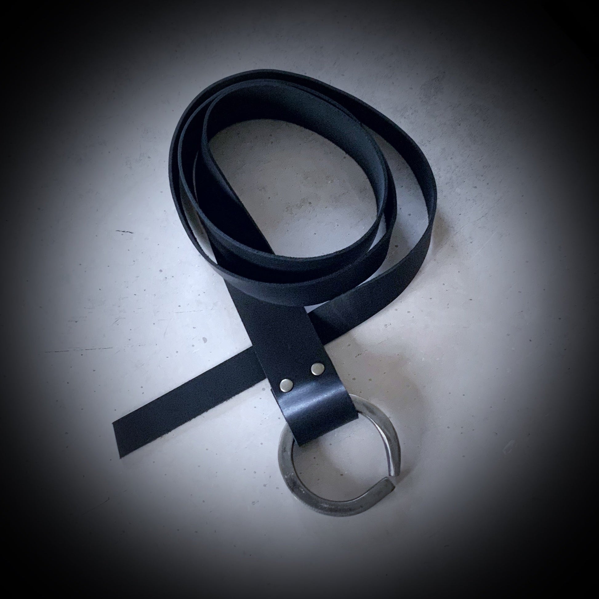 A tapered chunky steel elongated square ring forms the basis for the approximately 150cm belt, that can be fashioned in a knot of your liking.