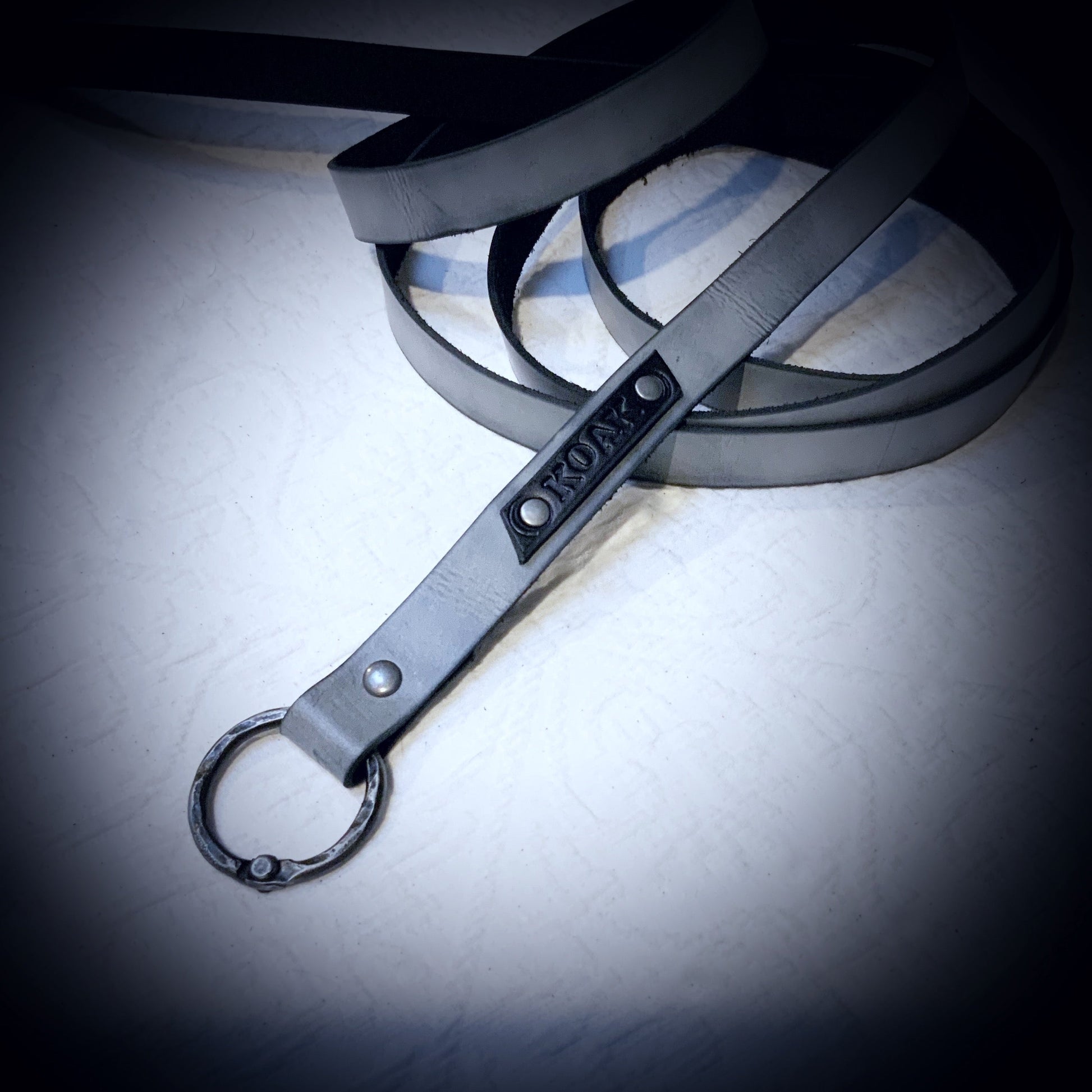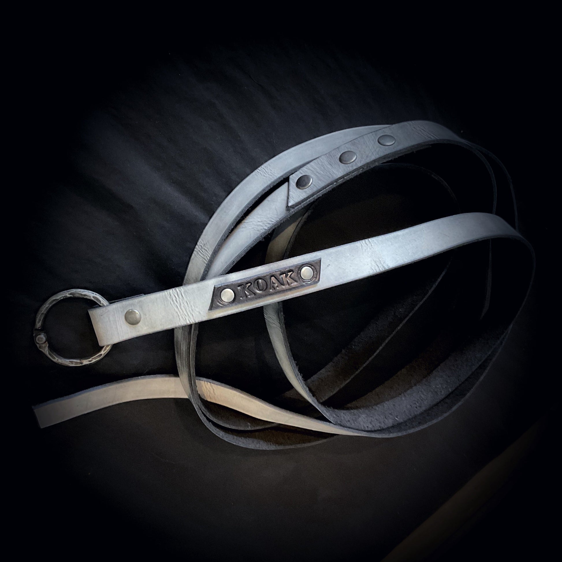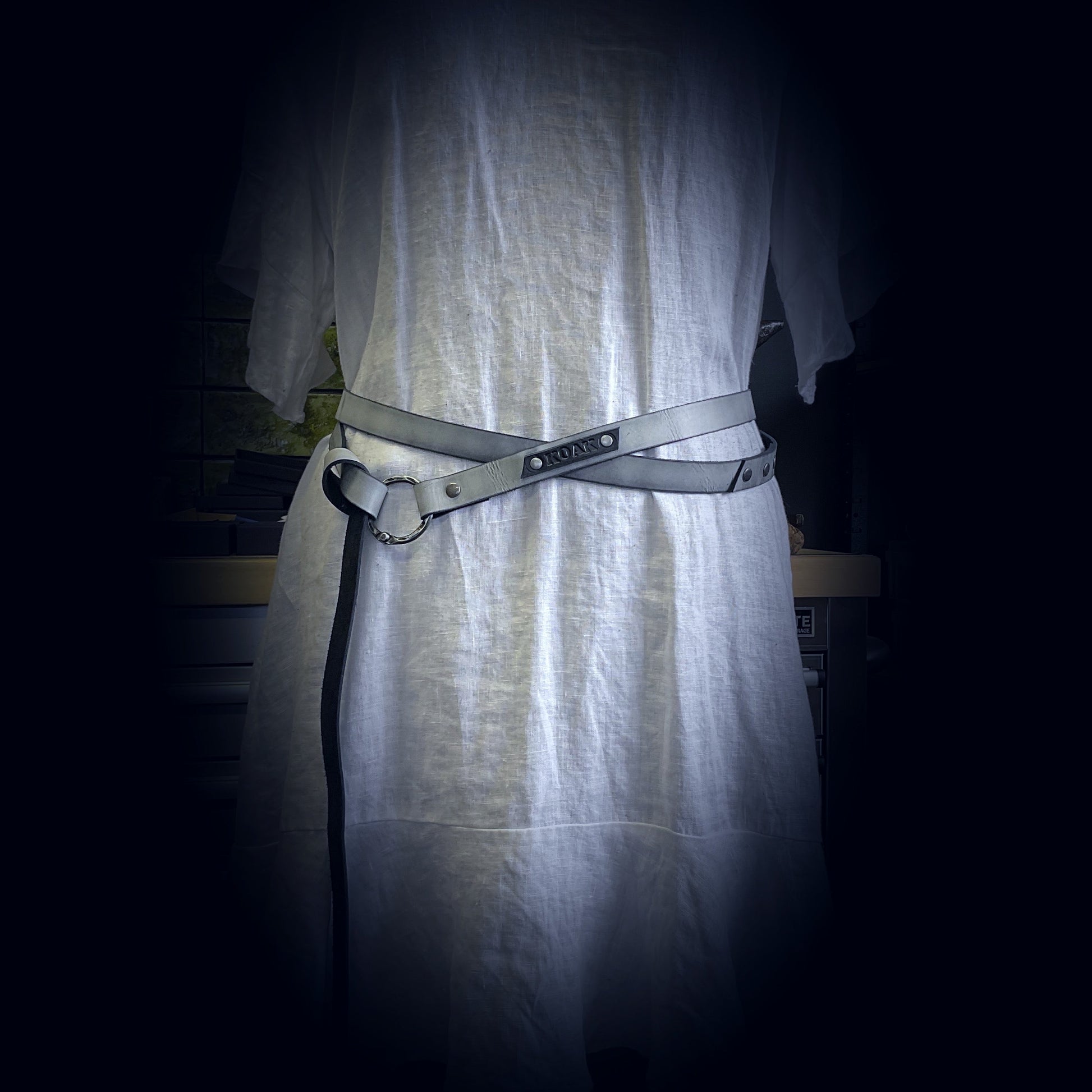 A tapered 1.5 inch steel ring forms the basis for the approximately 2.5 metre belt, that can be fashioned in a knot of your liking.