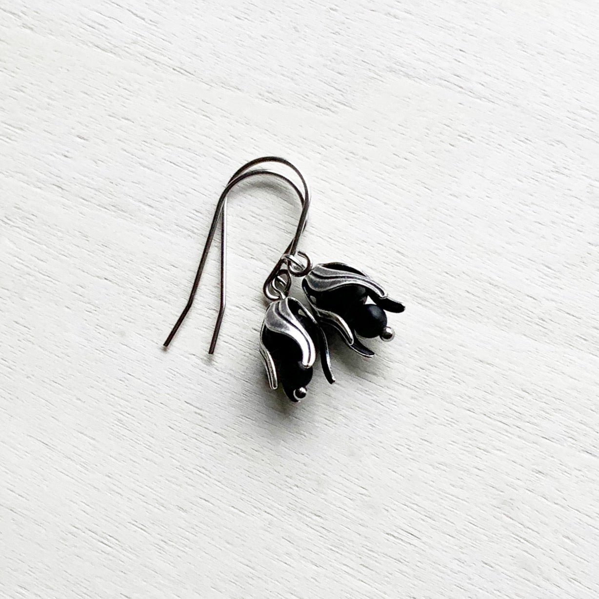 These fold form tulips have been crafted from brass and plated in fine silver (999) then oxidised and sealed to bring out the detail and give that beautiful antique finish. They are completed with hand selected black glass beads and stainless steel findings.