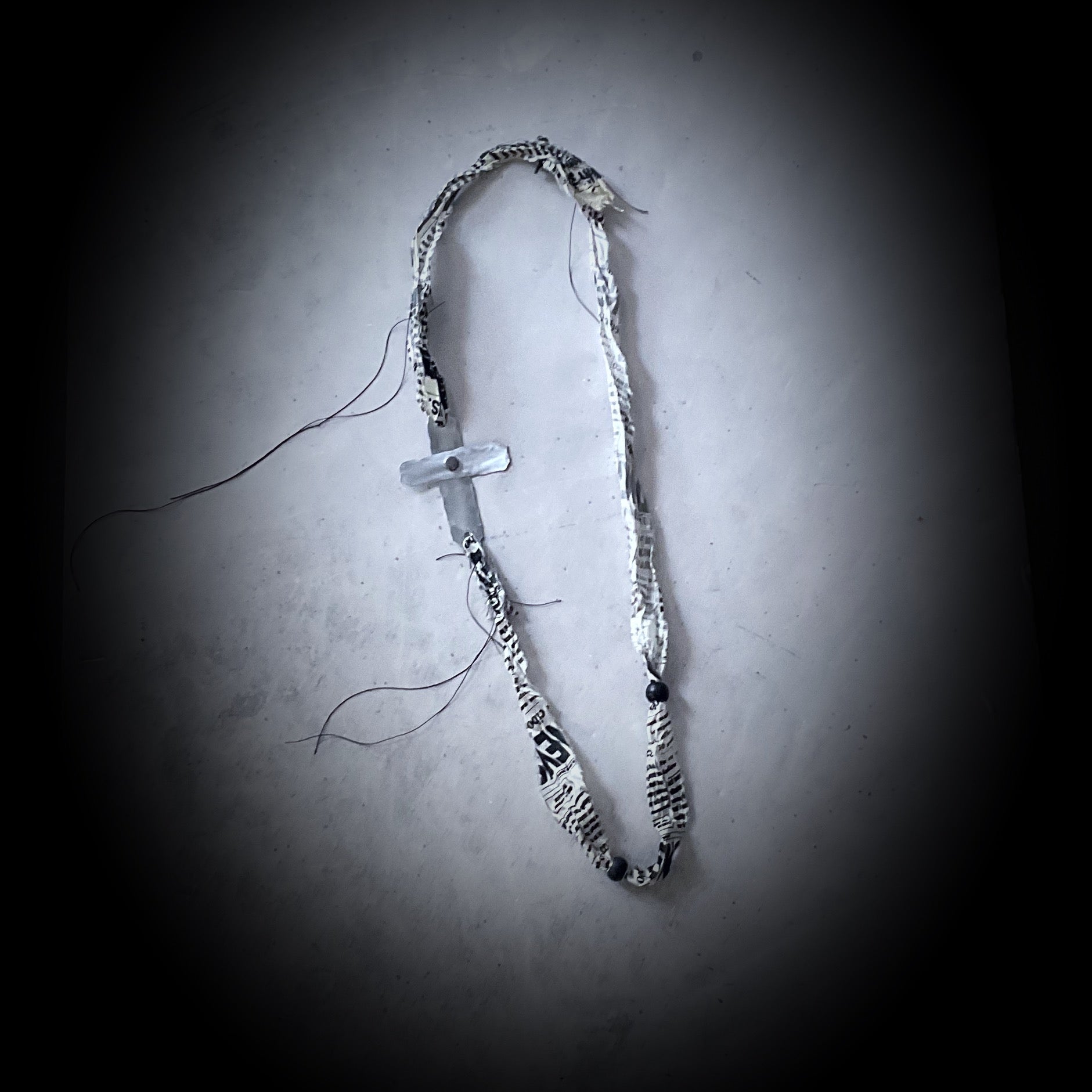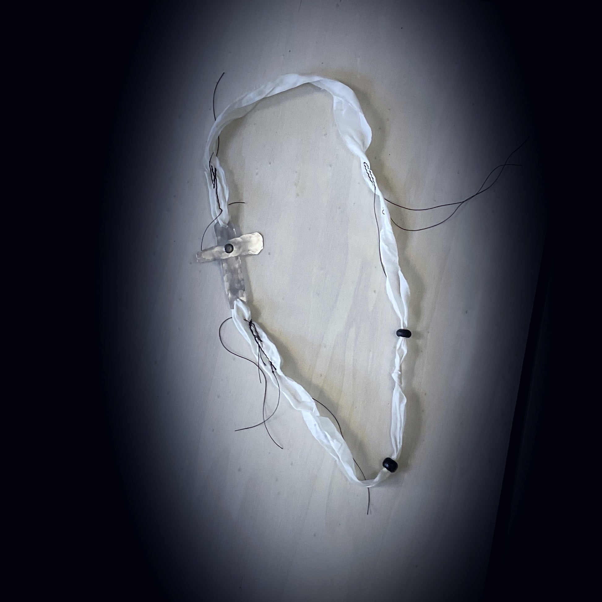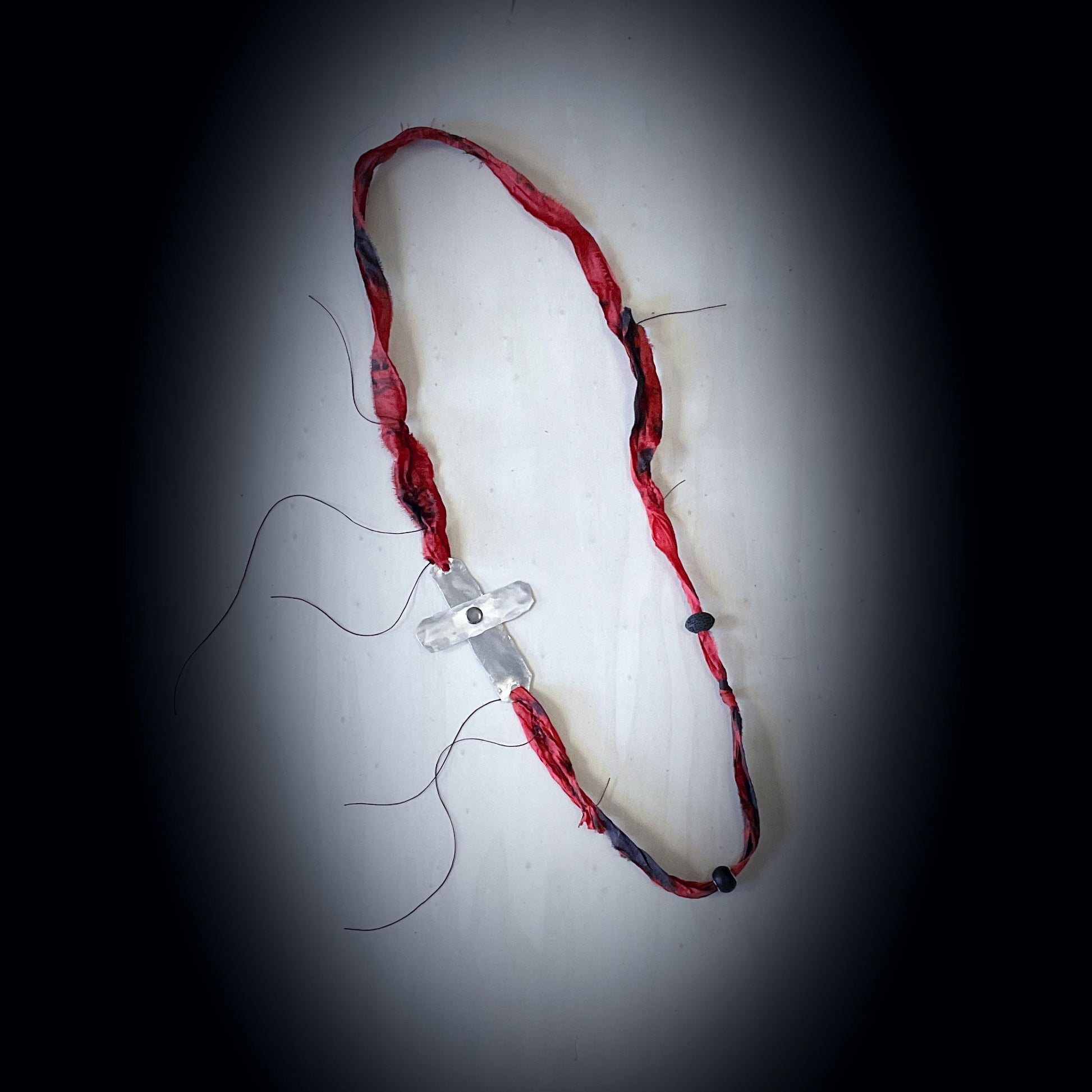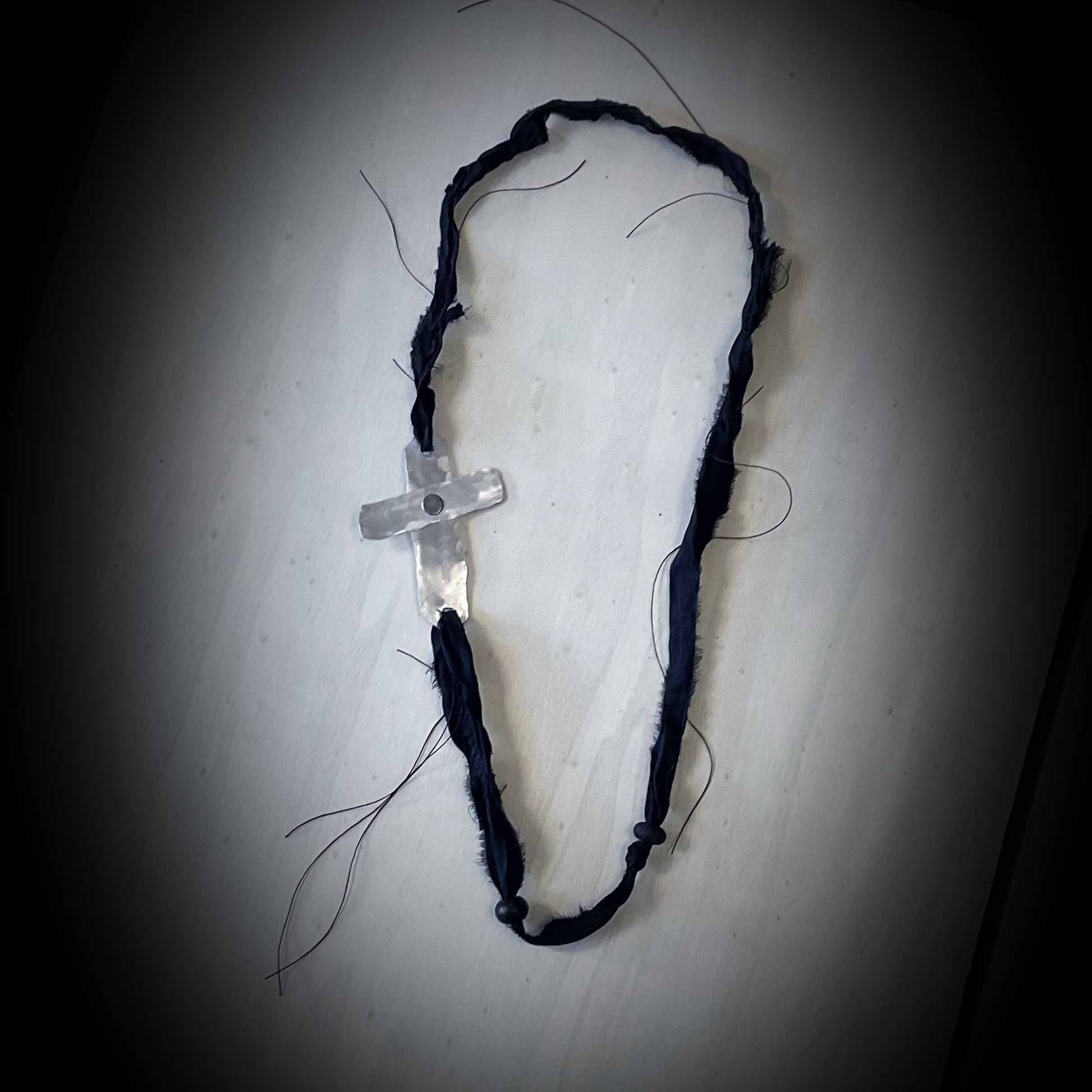 Crafted from premium hand dyed silk and a handcrafted organic aluminium cross feature, this neckmess is the ultimate statement piece that only gets better with wear. The focus is on the raw edges - this can be trimmed to your liking, random stitching (yes no two will be the same)and cross detail.