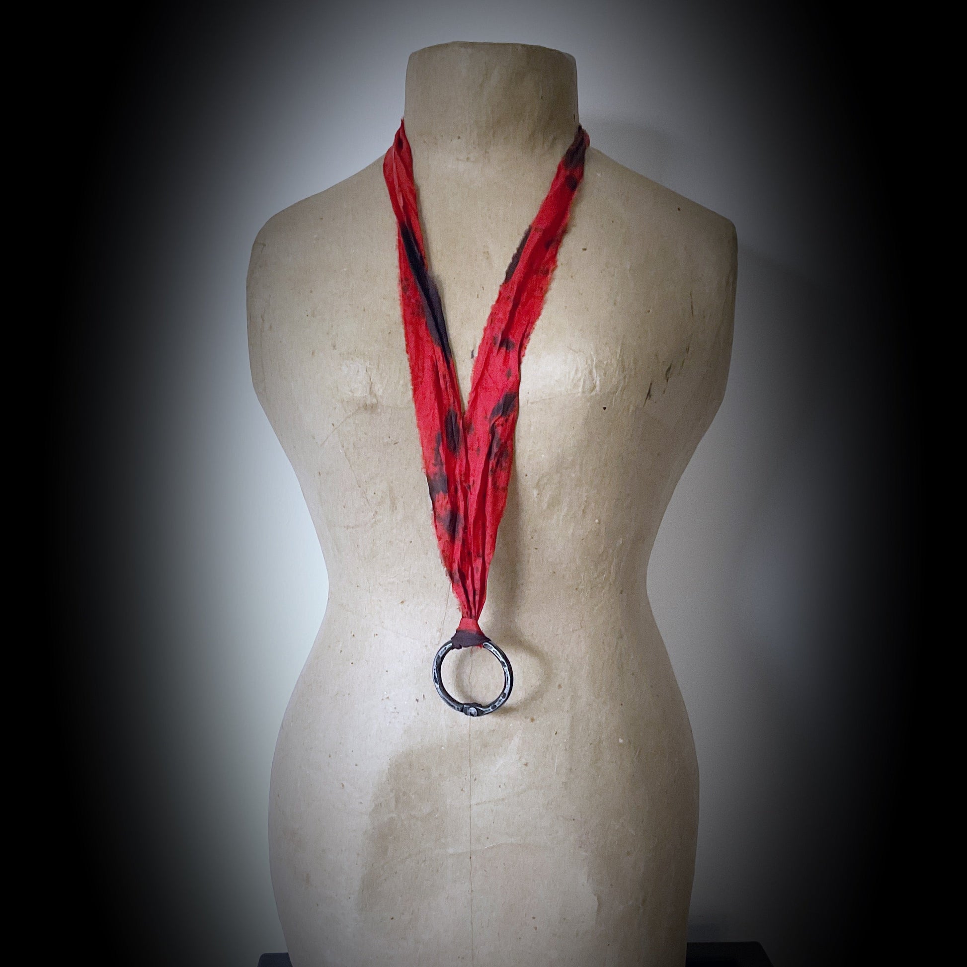 Crafted from premium hand dyed silk and a hand forged steel ring feature, this neckmess is the ultimate statement piece that only gets better with wear. The focus is on the raw edges - this can be trimmed to your liking, random stitching - yes no two will be the same!