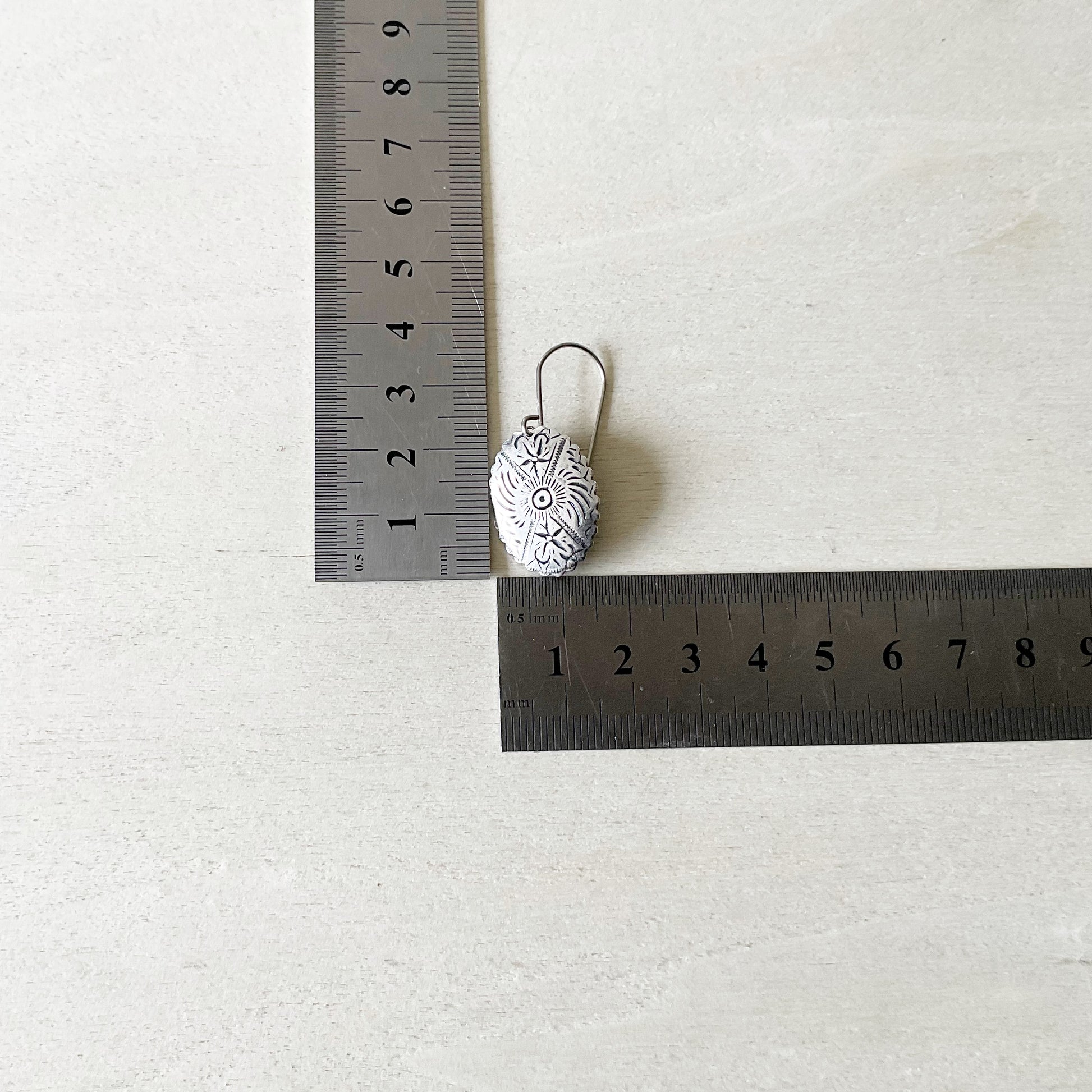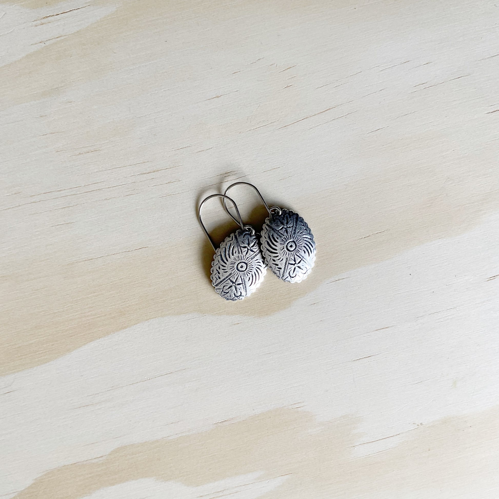 These earrings have been crafted from brass and plated in fine silver (999) then oxidised and sealed to bring out the detail and give that beautiful antique finish.