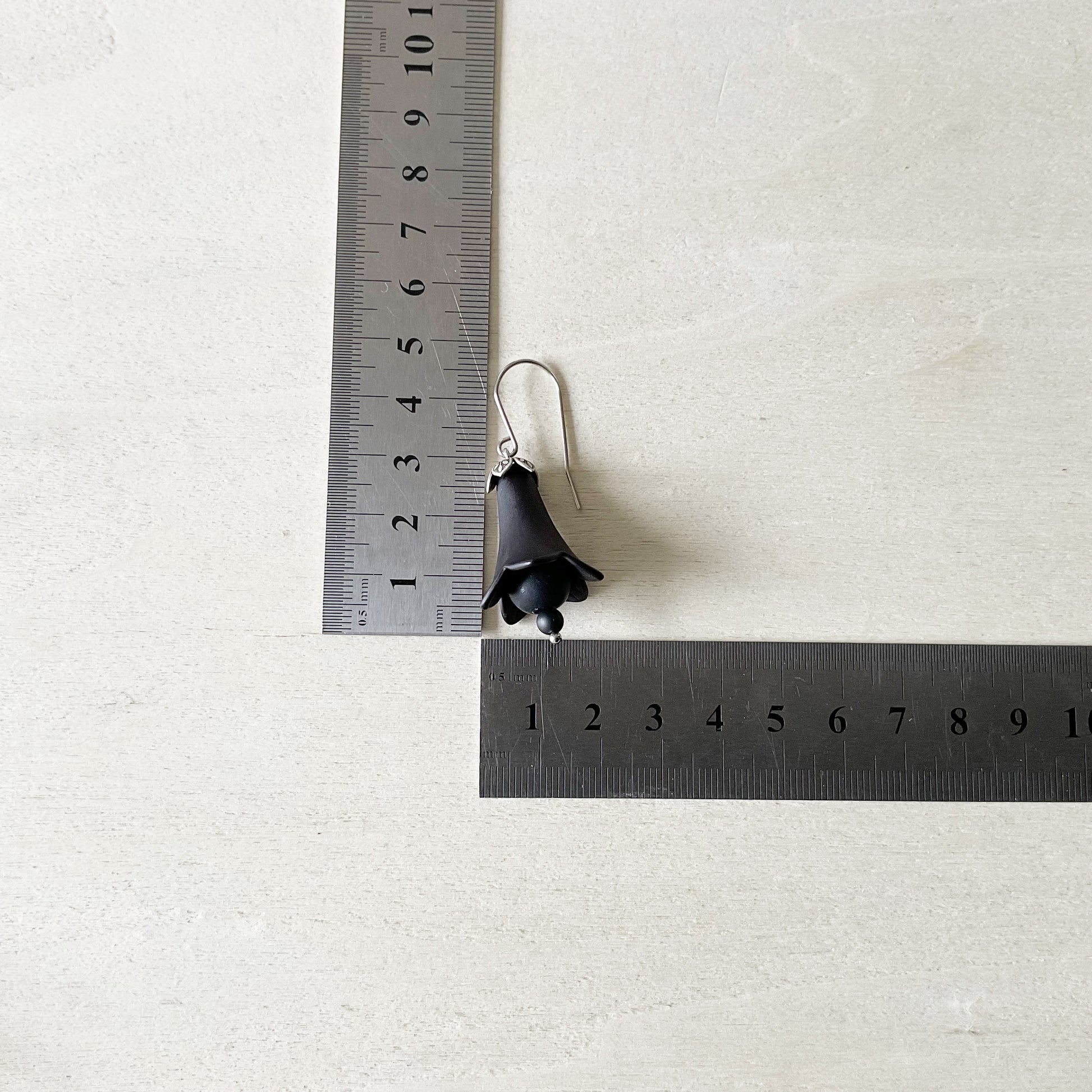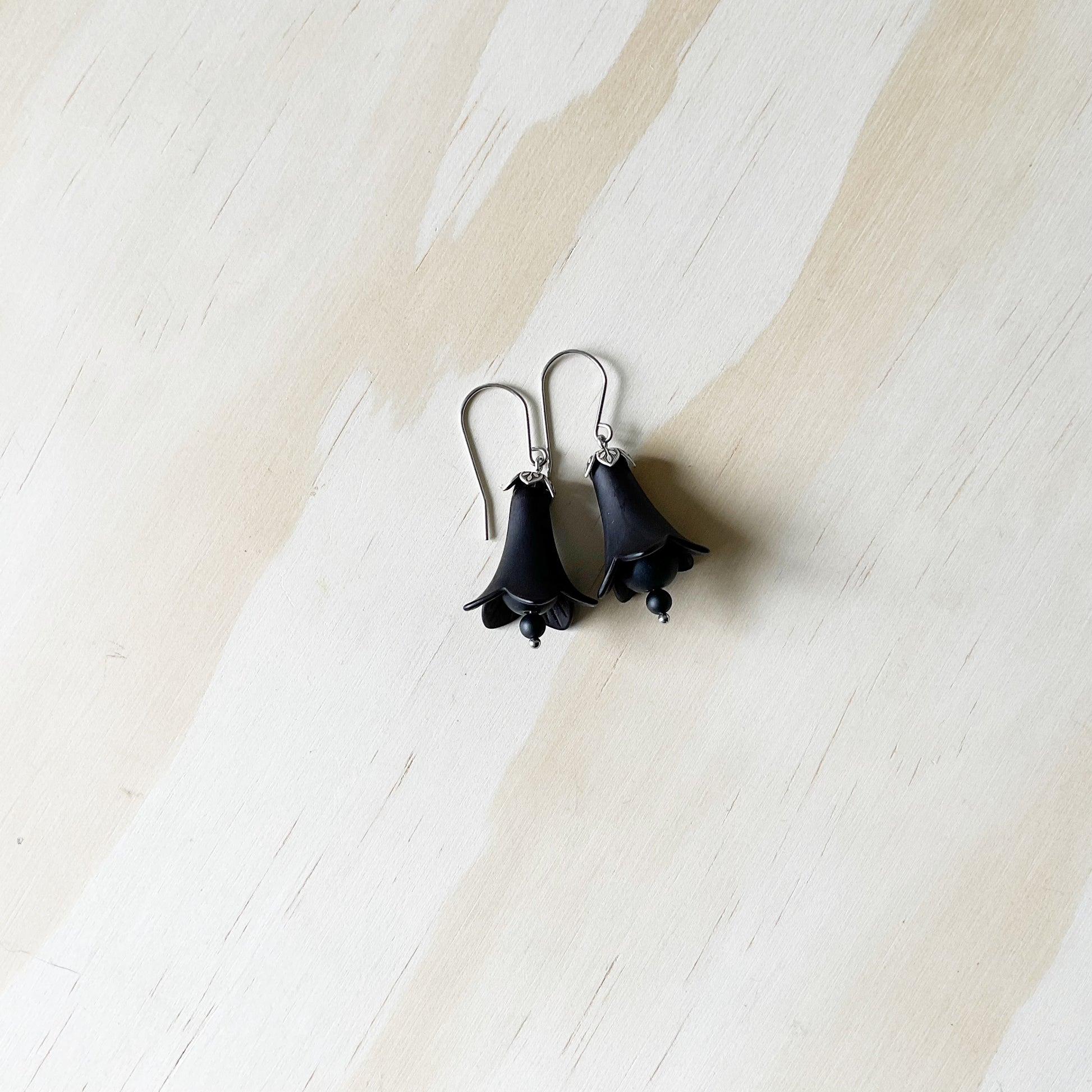 These earrings have been crafted from beautiful black resin flowers and adorned with pretty findings to create a realistic yet artisan take on a fuchsia flower.
